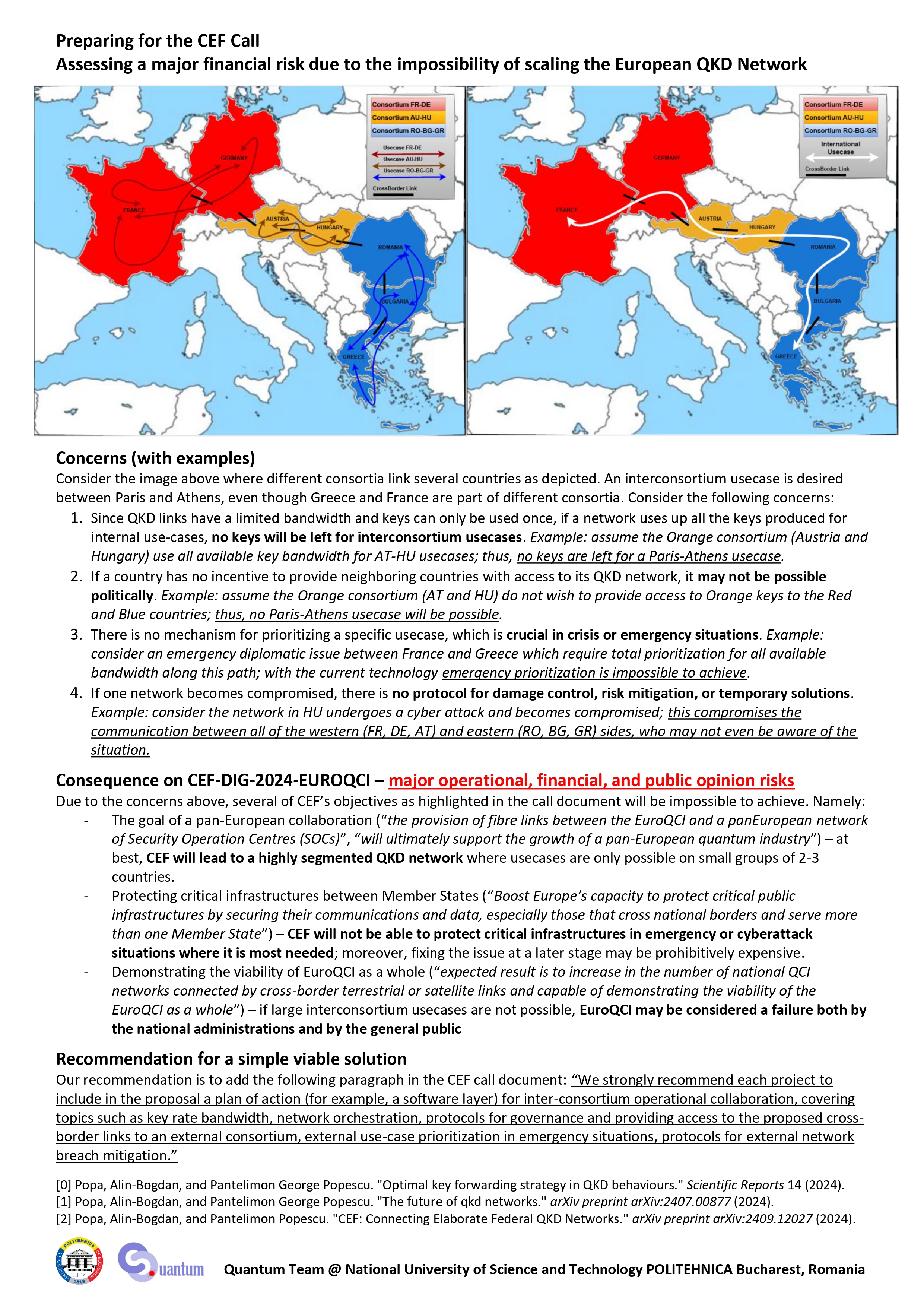 The scalability policy proposed by POLITEHNICA Bucharest impacted all CEF EuroQCI Phase 2 consortium applications which, following the recommendation from EC and PETRUS, have integrated the recommended solution with a dedicated WP or group of tasks in their application. Based on research conducted by the Quantum team at POLITEHNICA Bucharest, several QKD scalability and network governance issues were distilled into a one-page recommendation authored by Prof. Pantelimon George Popescu and Dr. Alin-Bogdan Popa and shared at two dedicated online meetings organized via PETRUS with the applicants to EuroQCI Phase 2 (CEF-DIG-2024-EUROQCI). The recommendation was officially endorsed by EC, HaDEA, and PETRUS.